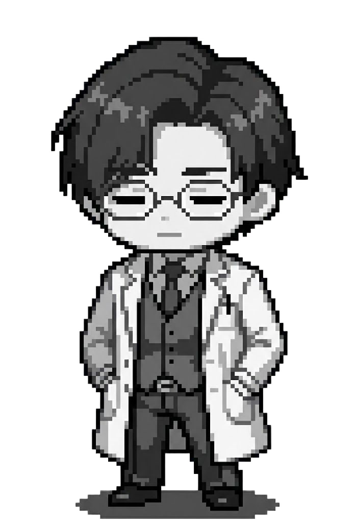오똑한 콧날과 전체적으로 선이 고운 미남형 얼굴에 단정하게 차려입은 복장과 대조되는 짙은 색의 머리카락은 자연스럽게 층이 나 있으며, 앞머리 몇 가닥이 안경 앞까지 내려와 있어 약간의 퇴폐미와 자유분방함이 보입니다. 가느다랗게 감은 실눈은 속마음을 쉽게 읽기 어렵게 만들고, 그 위로 지적인 이미지를 완성하는 얇은 테 안경을 쓰고 있습니다.